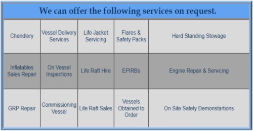 WE offer many services ranging from Chandlery Vessel Delivery Services Life Jacket Servicing Flares & Safety Packs Hard Standing Stowage Inflatables Sales & Repair On Vessel Inspections Life Raft Hire EPIRBs Engine Repair & Servicing, GRP Repair, Life Raft Sales Vessels Obtained to Order commissioning of new vessels On Site Safety Demonstartions repairing hulls and keels, installing new engines, spray-painting, polishing and antifouling,